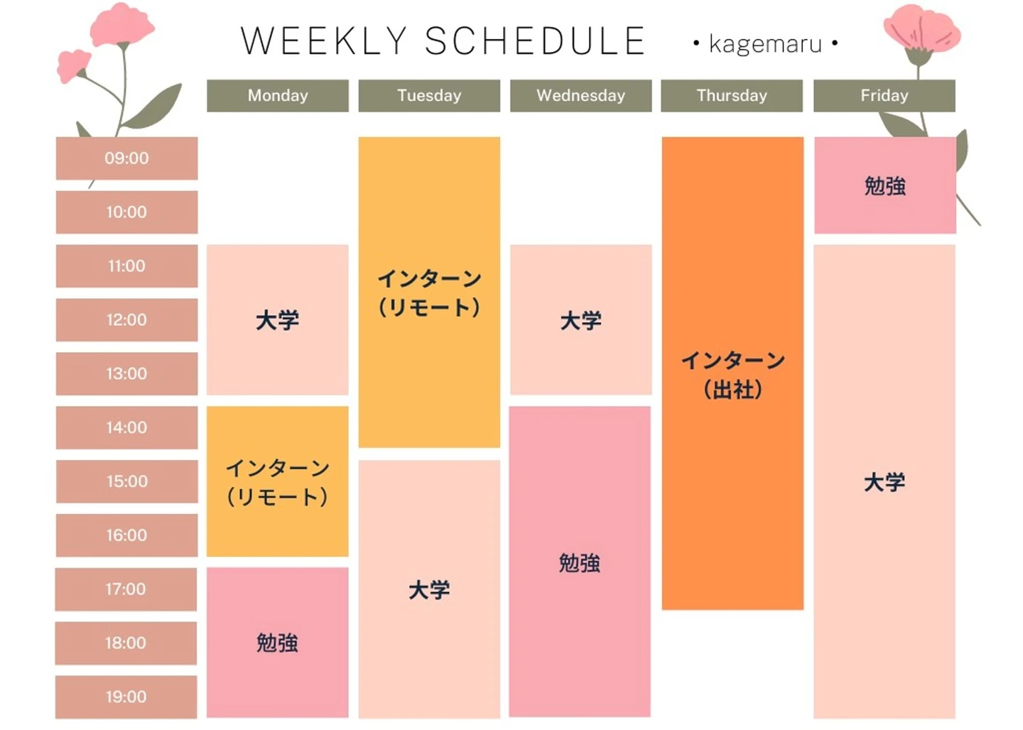 大学、インターン、勉強の時間をバランスよく確保できるようにしています。私の大学はかなり忙しいほうなので、授業や勉強、課題などの予定が多いときはリモート勤務にしてもらっています。 少し忙しいですが楽しく過ごせています!