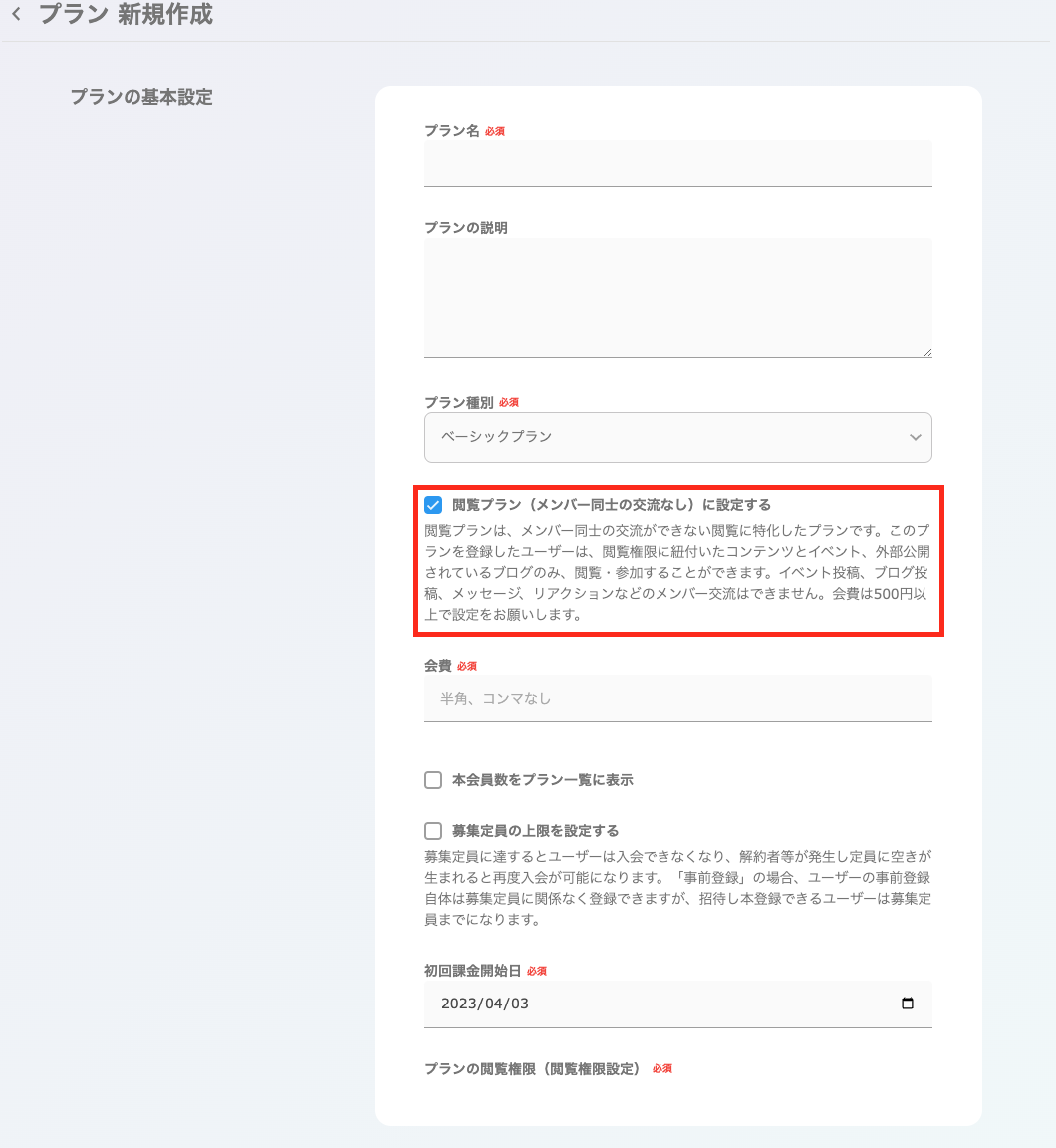 【管理画面>ユーザー>プラン>新規作成】より「閲覧プラン(メンバー同士の交流なし)に設定する」にチェックを付けることで作成が可能です。